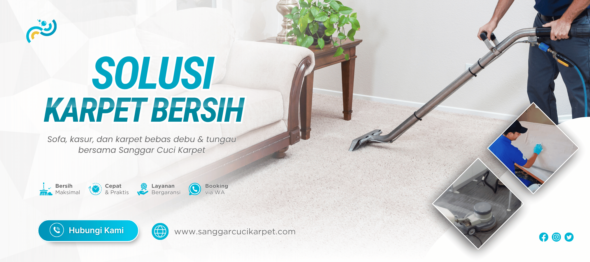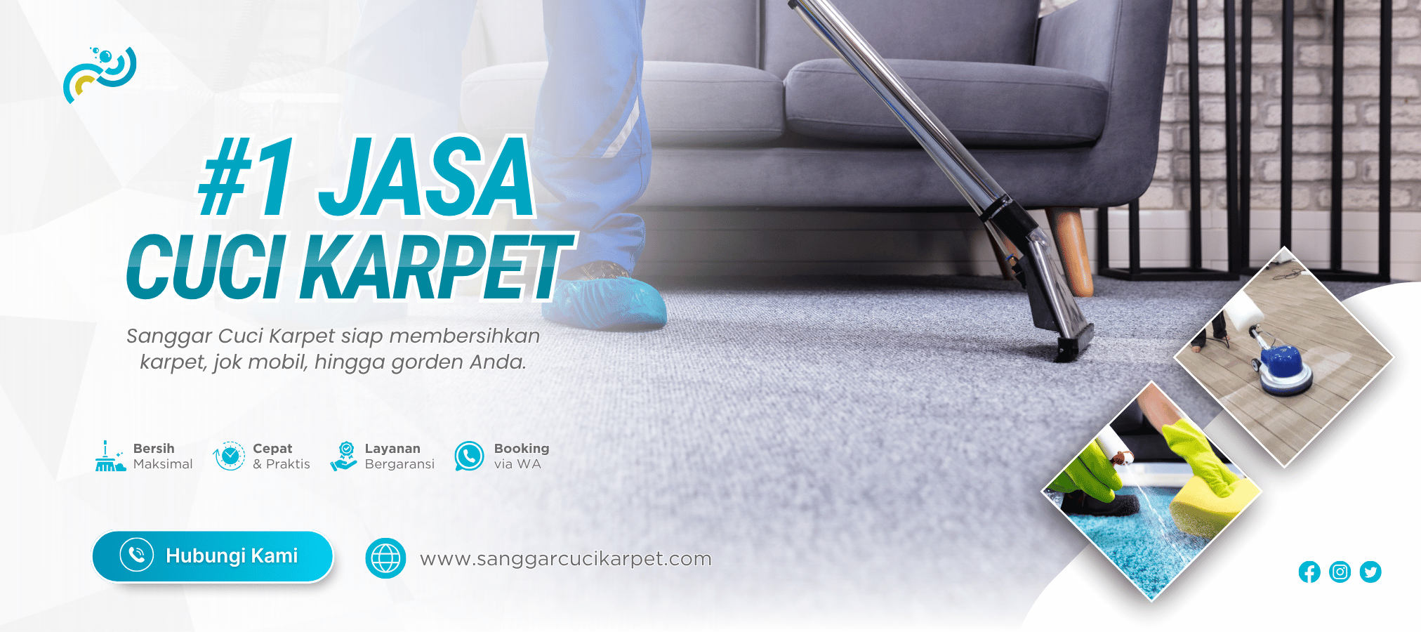 Kini Anda tidak perlu repot lagi — cukup booking via WhatsApp, tim kami akan datang langsung ke lokasi Anda. Proses cuci cepat, 1 hari selesai, pengeringan mudah, dan hasil yang bersih, wangi, higienis, serta bergaransi. Percayakan kebutuhan cuci rumah dan kendaraan Anda pada Sanggar Cuci Karpet — karena kenyamanan keluarga Anda adalah prioritas kami.